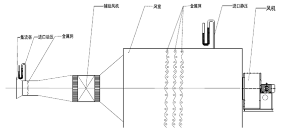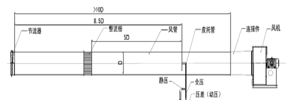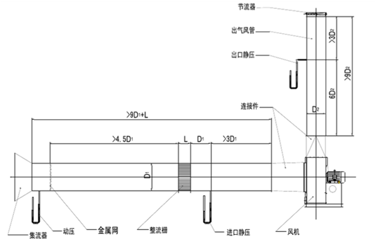 進氣試驗裝置:在風機進氣口端面連接測試風管,而出氣端開向大氣。