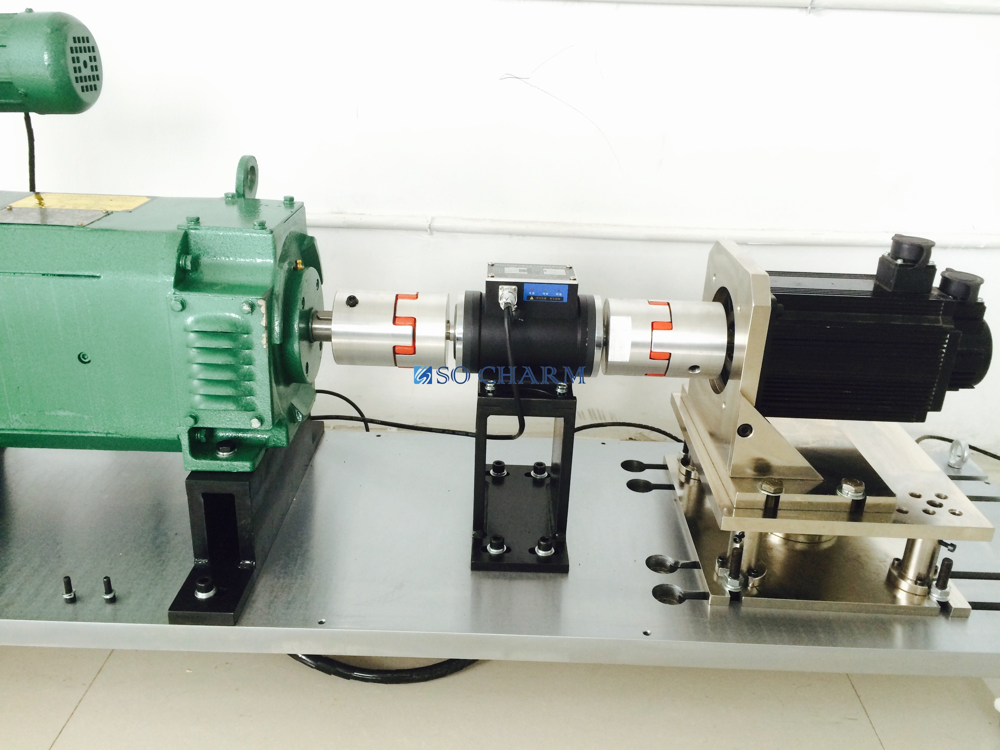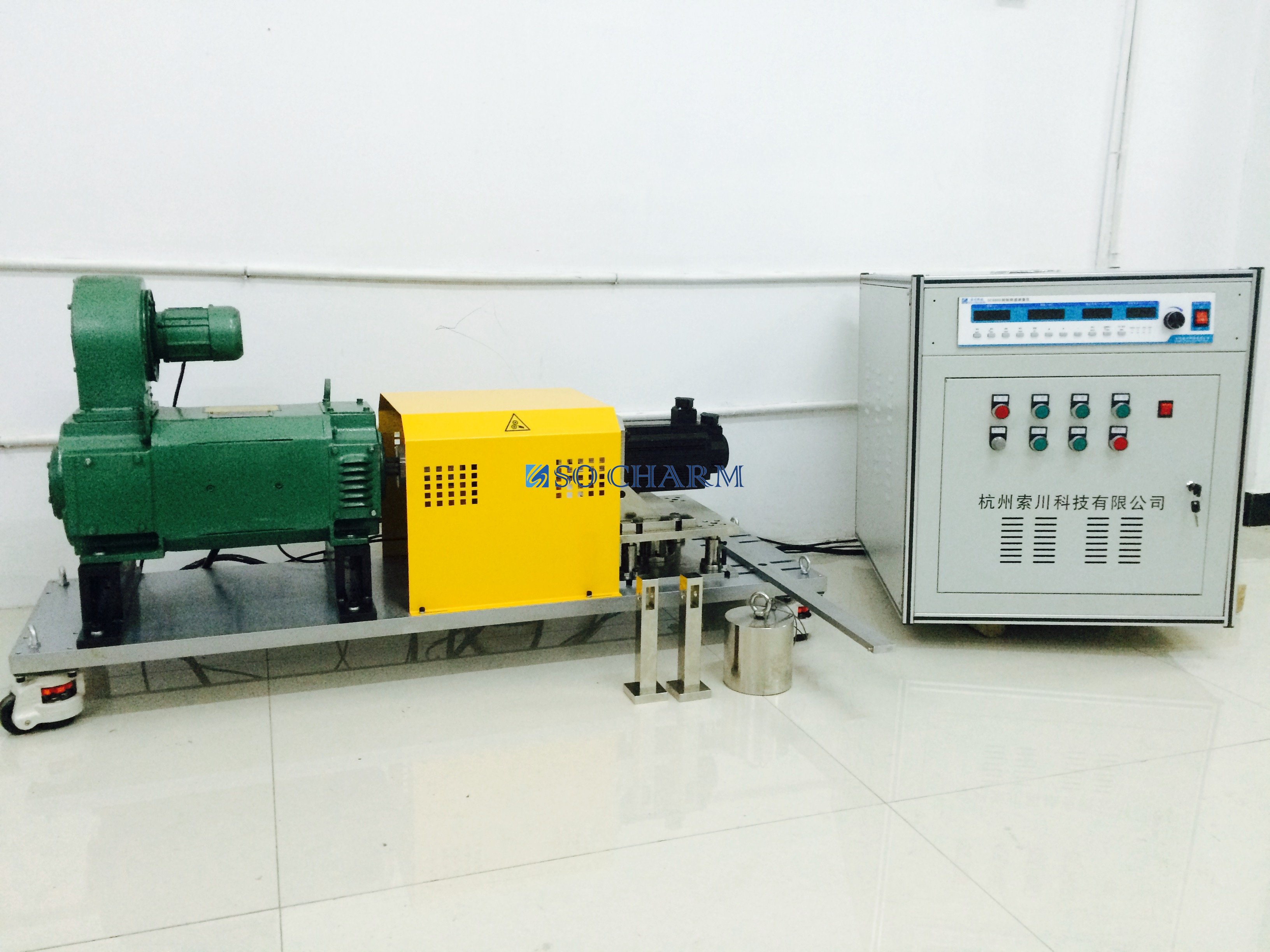 1、 直流電力測功機,由直流電機、測力計和測速發(fā)電機組合而成。直流電機的定子由獨立的軸承座支撐,它可以在某一角度范圍內(nèi)自由擺動。機殼上帶有測力臂,它與測功機配合,可以檢測定子所受到的轉(zhuǎn)矩。根據(jù)直流電機原理,電機的電磁轉(zhuǎn)矩同時施加于定子和轉(zhuǎn)子。定子所受到的轉(zhuǎn)矩與轉(zhuǎn)子所受到的轉(zhuǎn)矩大小相等,方向相反,所以轉(zhuǎn)軸上的轉(zhuǎn)矩可以由定子上測量。運行中軸承、電刷和風(fēng)致摩擦等引起的機械轉(zhuǎn)矩,會使定子和轉(zhuǎn)子所受的轉(zhuǎn)矩不完全相等,這給測量所帶來的誤差需要加以考慮。由于直流電機整流子需要專業(yè)維護,無法高速運轉(zhuǎn),而且逆變器回饋質(zhì)量不好,功率因數(shù)較低,容易引起故障,特別是在較大功率時,因此現(xiàn)在我們一般不建議采用。